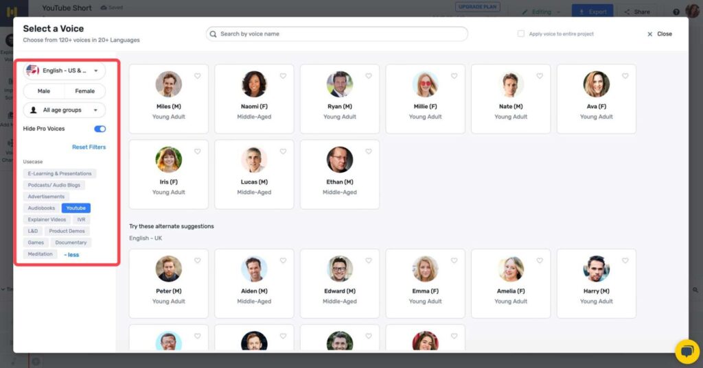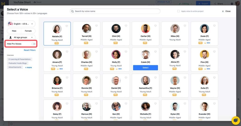 If you’re following along with the free version, toggle Hide Pro Voices to view the available voices.