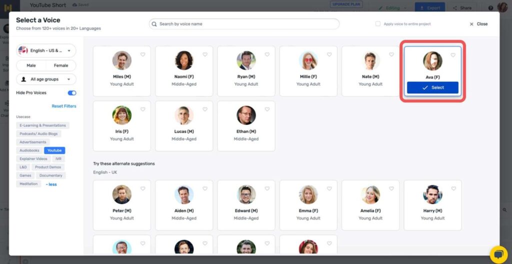 We’ll use Ava for our video because she has the most natural-sounding voice for our project. However, feel free to preview each one to determine which one works best for your situation. Once decided, click the select button.