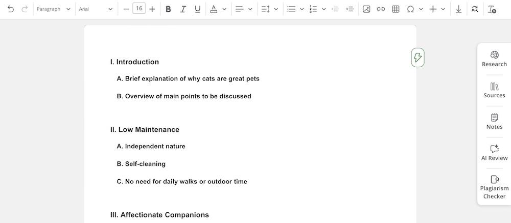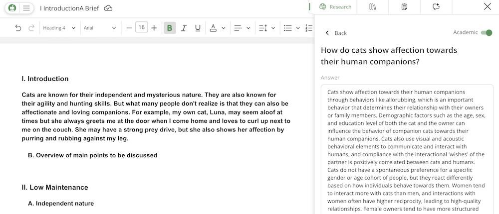 - Use the integrated research capabilities to find and cite sources directly within your document.
