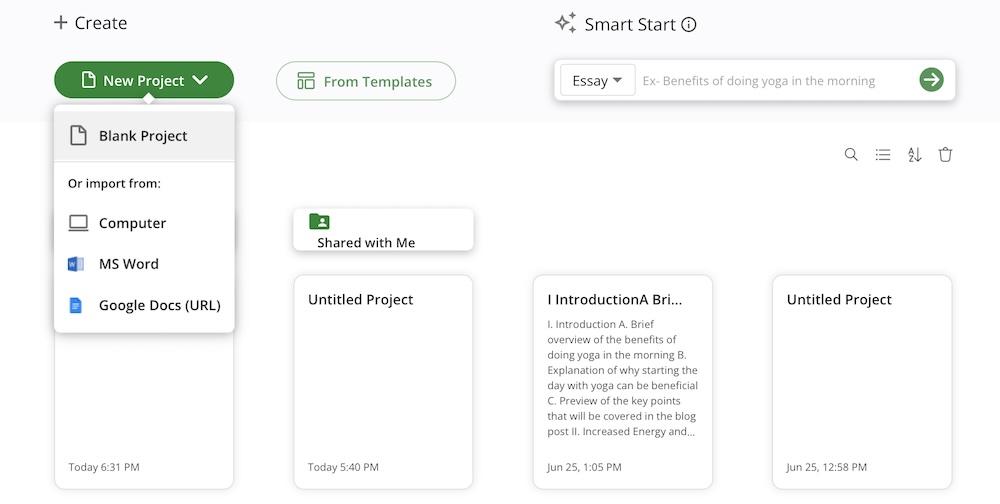 - You can take multiple approaches to get started. You can click New Project and select Blank, or import from Computer, MS Word, or Google Docs.