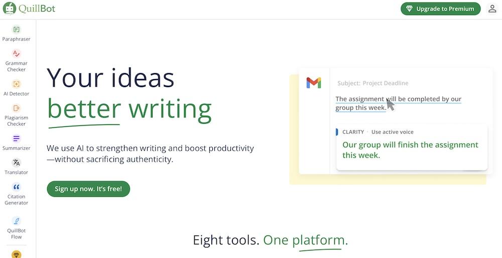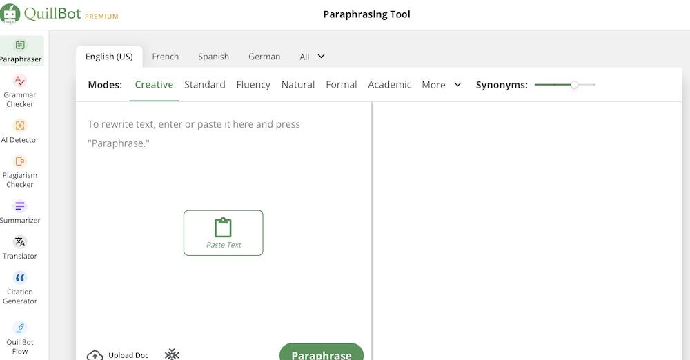 The platform’s straightforward design lets you easily switch between tools like paraphrasing, grammar checking, and summarizing.